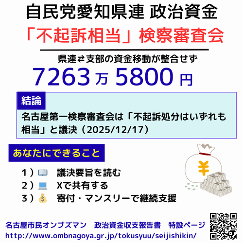 名古屋市民オンブズマンは24/5/2に、「自由民主党愛知県支部連合会と県内各支部の政治資金収支報告書を精査したところ、平成30年-令和4年に各支部への支出が約7700万円不記載、各支部からの収入が約1200万円不記載」であったと記者会見で発表しました。