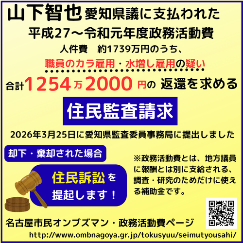 名古屋市民オンブズマンは、山下智也愛知県議に対して支給された令和2〜6年度政務活動費のうち、職員のカラ雇用・水増し雇用の疑い、支払元が不明確なタクシー代・ガソリン代・電話代の政務活動費からの支出に対して、合計1621万0456円の返還を求める住民監査請求を、2025年12月23日に愛知県監査委員事務局に提出いたしました。