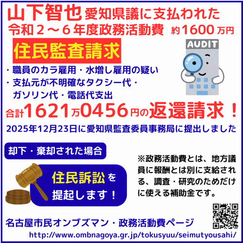 山下智也愛知県議に支払われた令和2〜6年度政務活動費約1600万円 住民監査請求